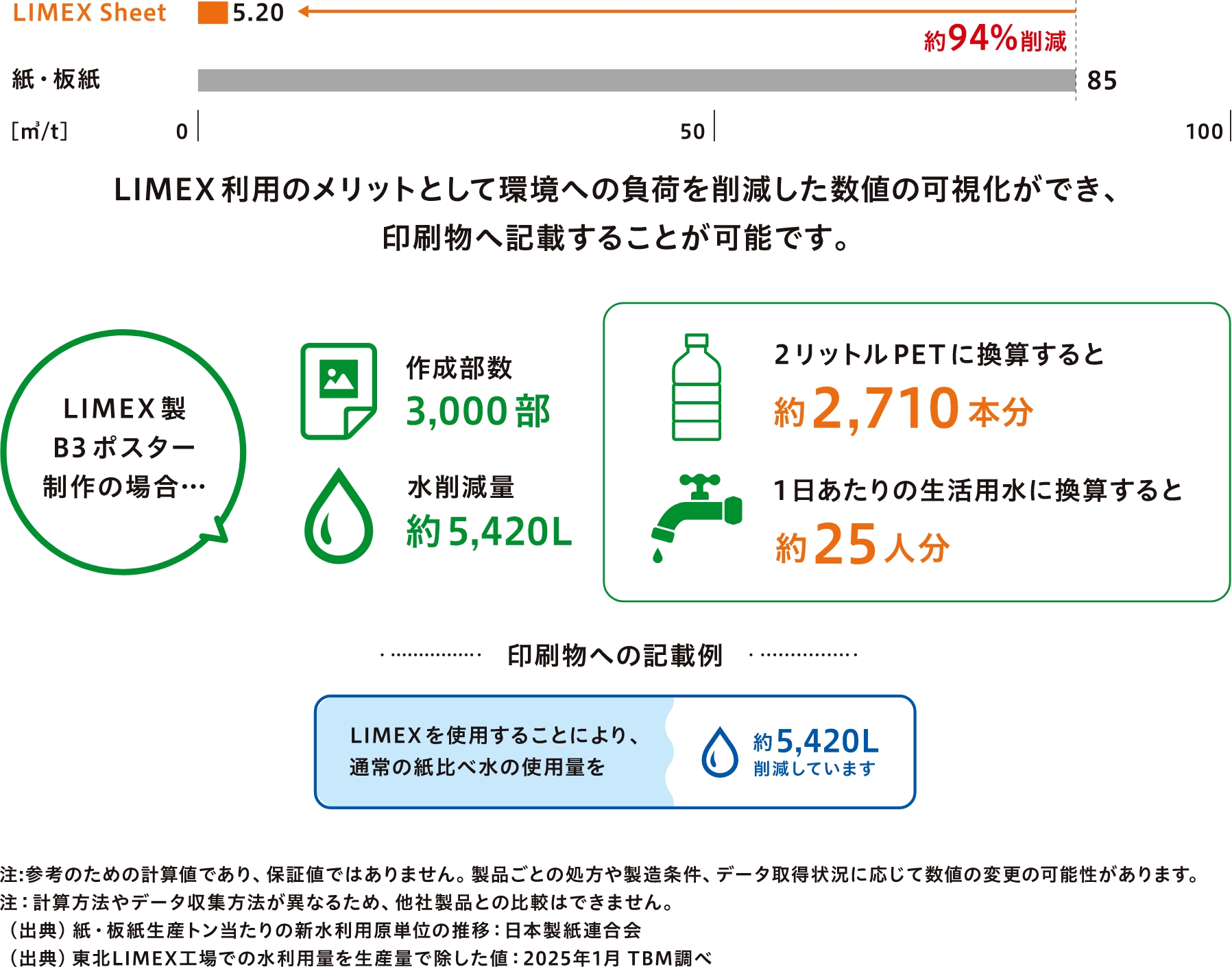 炭酸カルシウム(石灰石)などを主原料とし、製造工程で水資源をほとんど使用せず、森林資源も用いないため枯渇リスクの高い資源の保全に貢献しています。耐久性に優れており、一般的な紙製と比較して破れにくい特徴があります。LIMEXSheetは、実質「100%再生可能エネルギー由来」「CO2排出係数ゼロ」の電力を使用している工場で製造されています。