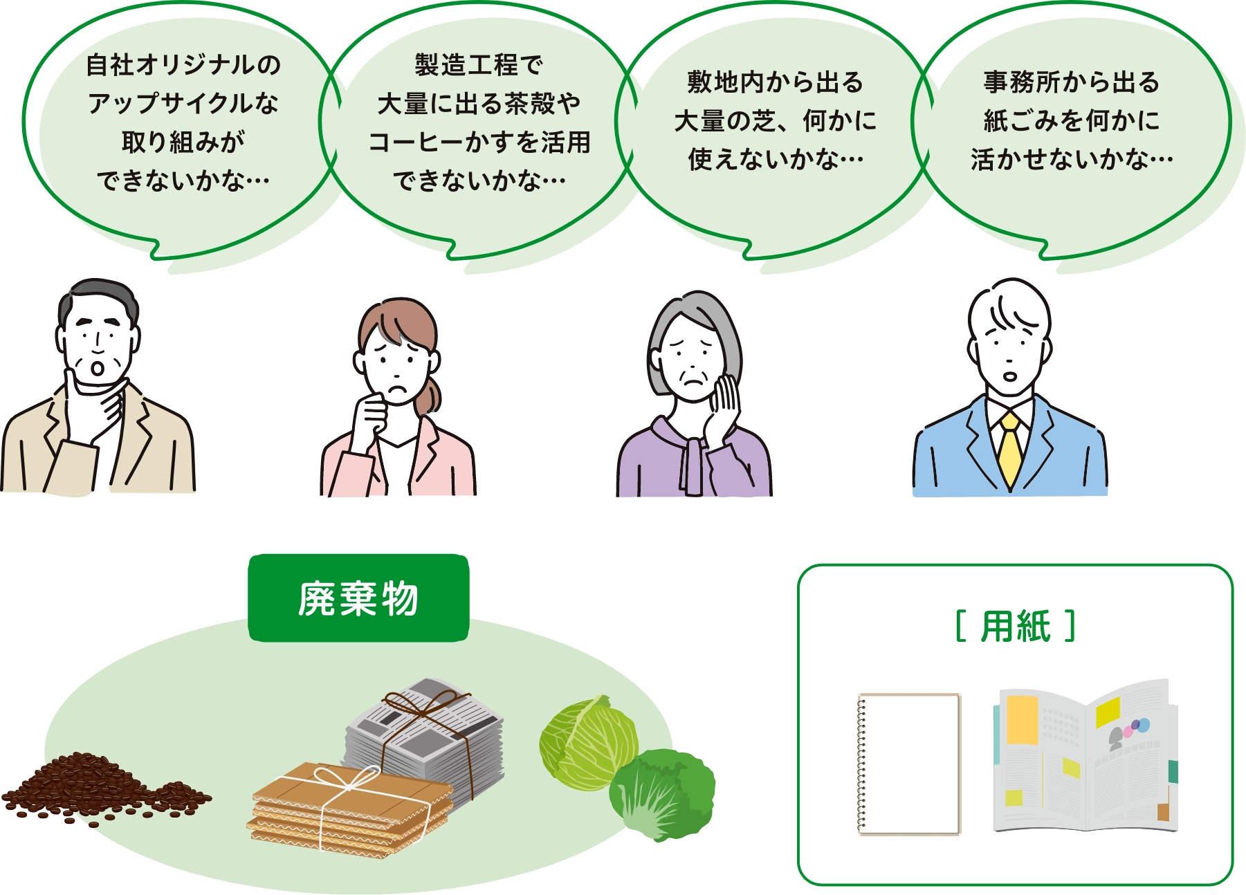 お客さまの元で発生する廃棄物や製造副産物など(加工残さ物や、調理くず、廃棄プラスチック類、古紙など)を紙に抄きこみ、混抄紙(こんしょうし)と呼ばれる再生紙をパートナー企業との循環型製品化ノウハウを生かし、製造いたします。 本取り組みは、サーキュラーエコノミー(循環型経済)の理念を具現化する取り組みです。廃棄物を「捨てる」から「再利用する」へとシフトすることで、持続可能な社会の構築に貢献します。 廃棄物が新たな資源となり、それが再び経済の循環に組み込まれるプロセスを通じて、無駄のない社会を目指しています。