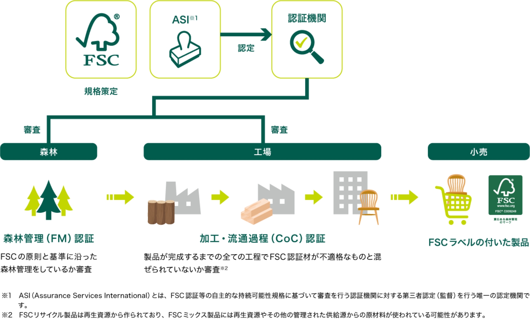 FSC®認証制度とは、森林を適切に管理し、環境や地域社会に配慮しているかどうかを第三者認証による徹底したシステムで評価し認証する仕組みです。 FSC®認証製品は、製品が完成するまでの生産・加工・流通に関わるすべての組織が認証を受ける必要があります。 FSC®認証紙の利用促進は適切な森林管理を行う林業者を支援し、森林保全に貢献することにつながります。森林破壊ゼロへの対応策としても注目され、急速に普及が進んでおり、世界に通用するグローバルな環境PRが可能です。