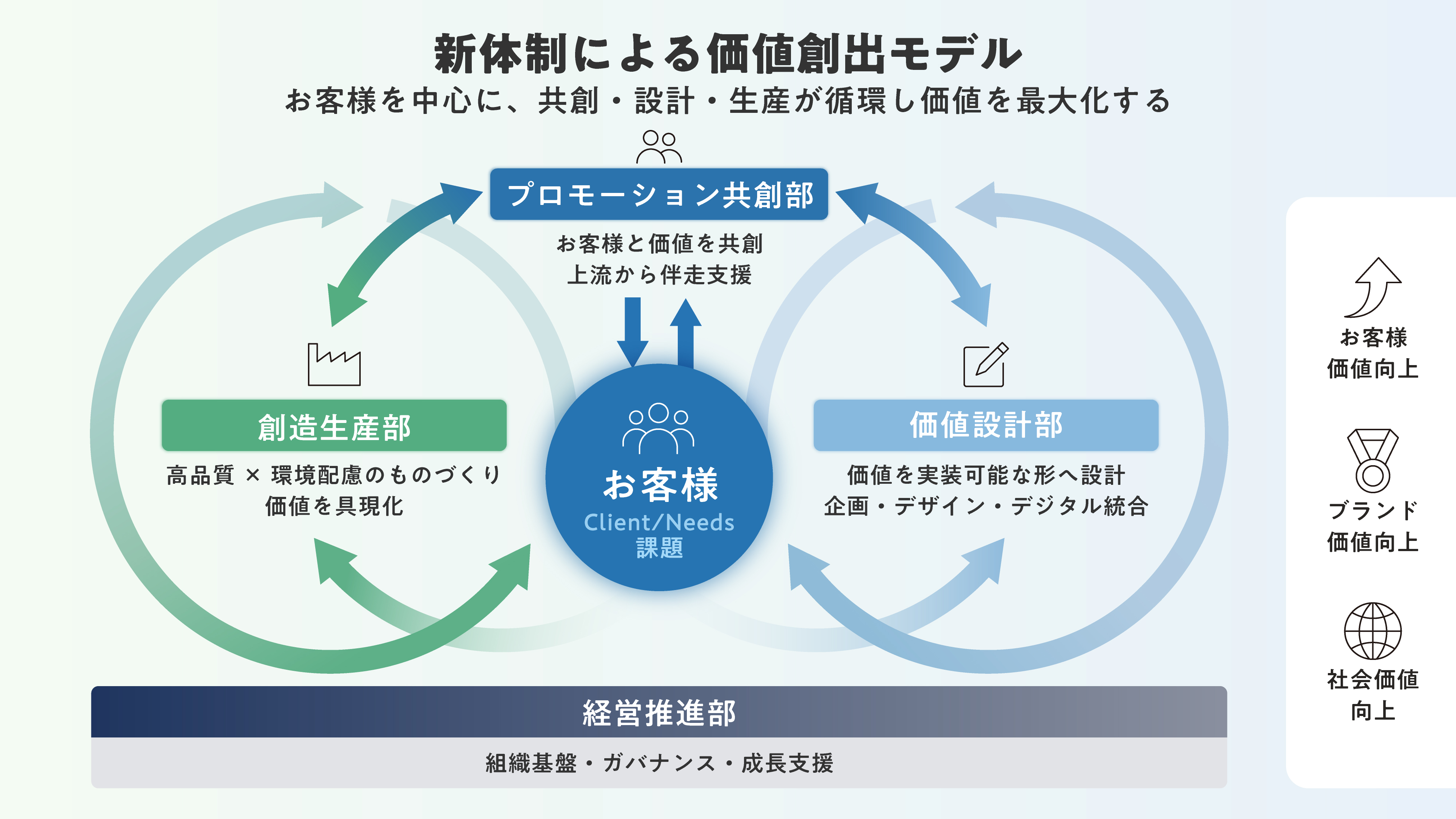 創造生産部が高品質かつ環境価値のあるものづくりを担い、